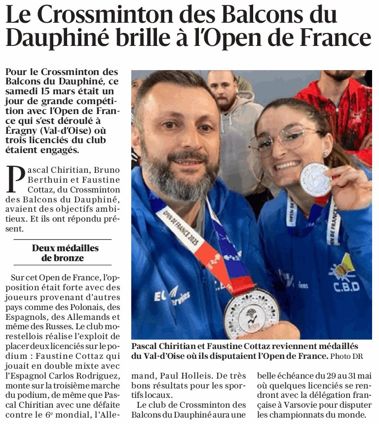 Lors de cette édition, 3 dauphinois sont partis représenter notre club lors de ce grand tournoi : Pascal CHIRITIAN en 040 et Bruno BERTHUIN en O50 (Tout deux engagés en double O40 ensemble) et Faustine COTTAZ en Open Femmes et Doubles Mixte !